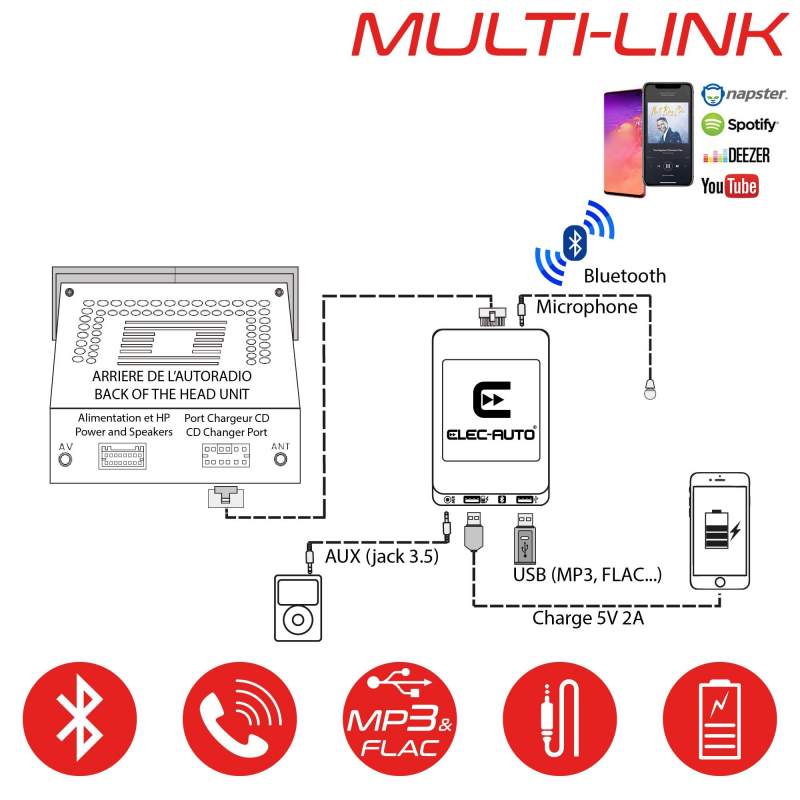 Le MULTI-LINK est une interface Bluetooth, USB et auxiliaire conçue par ELEC-AUTO qui va transformer votre autoradio d’origine Citroën et vous permettre de :